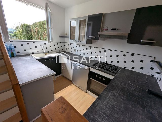 - 1 cuisine ouverte sur salon, sublimée par un poêle à bois, créant une atmosphère chaleureuse et conviviale,