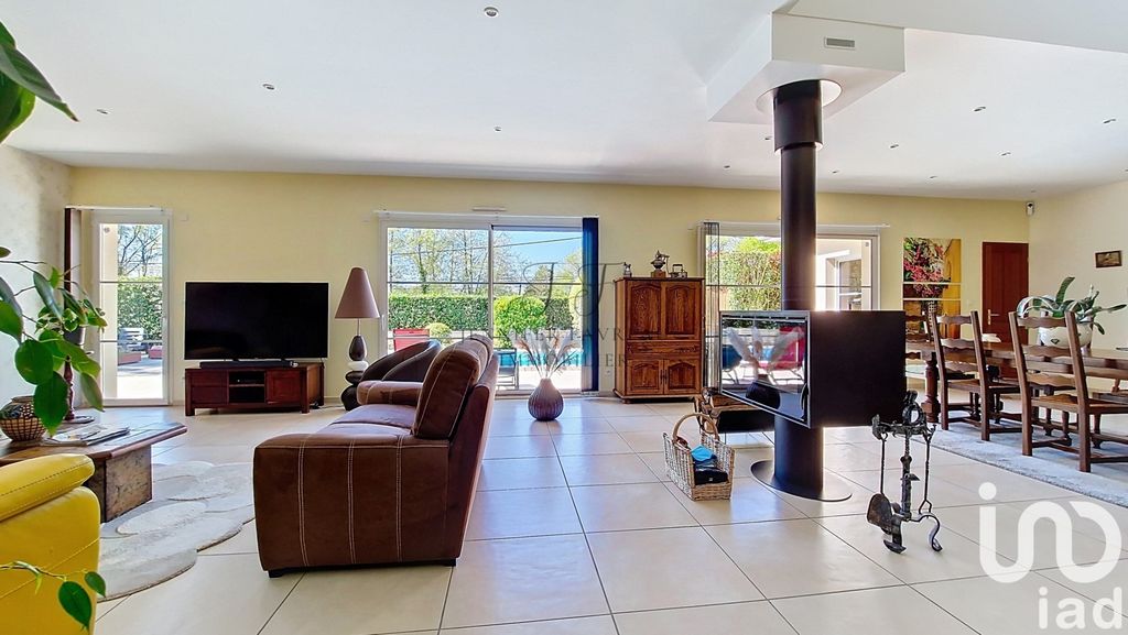 Un salon/séjour baigné de lumière de 85 m², avec poêle à bois et larges baies vitrées ouvertes sur la terrasse et la piscine.