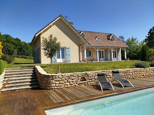 - espaces terrasses bois et piscine avec filtration au chlore et bâche de protection