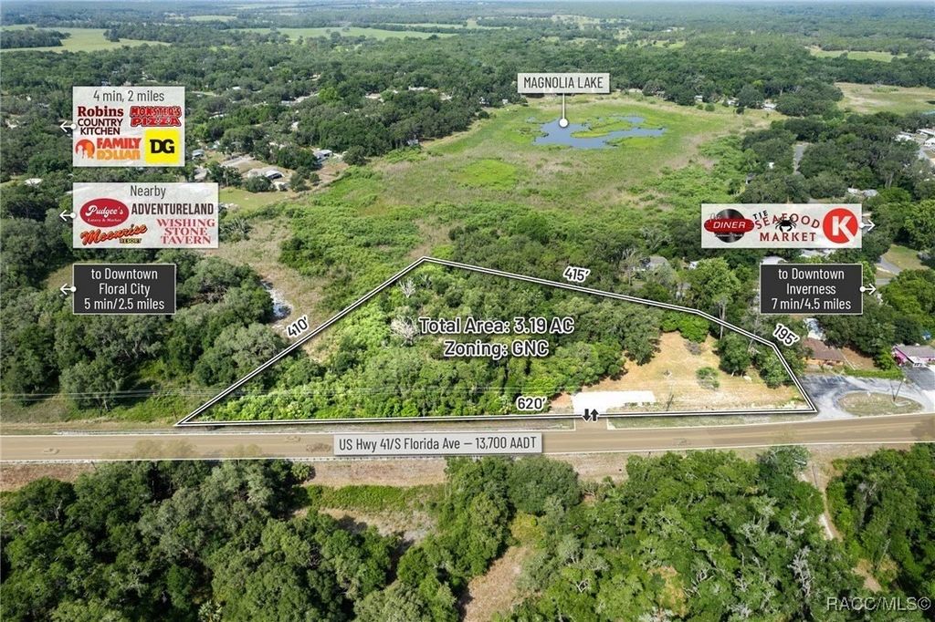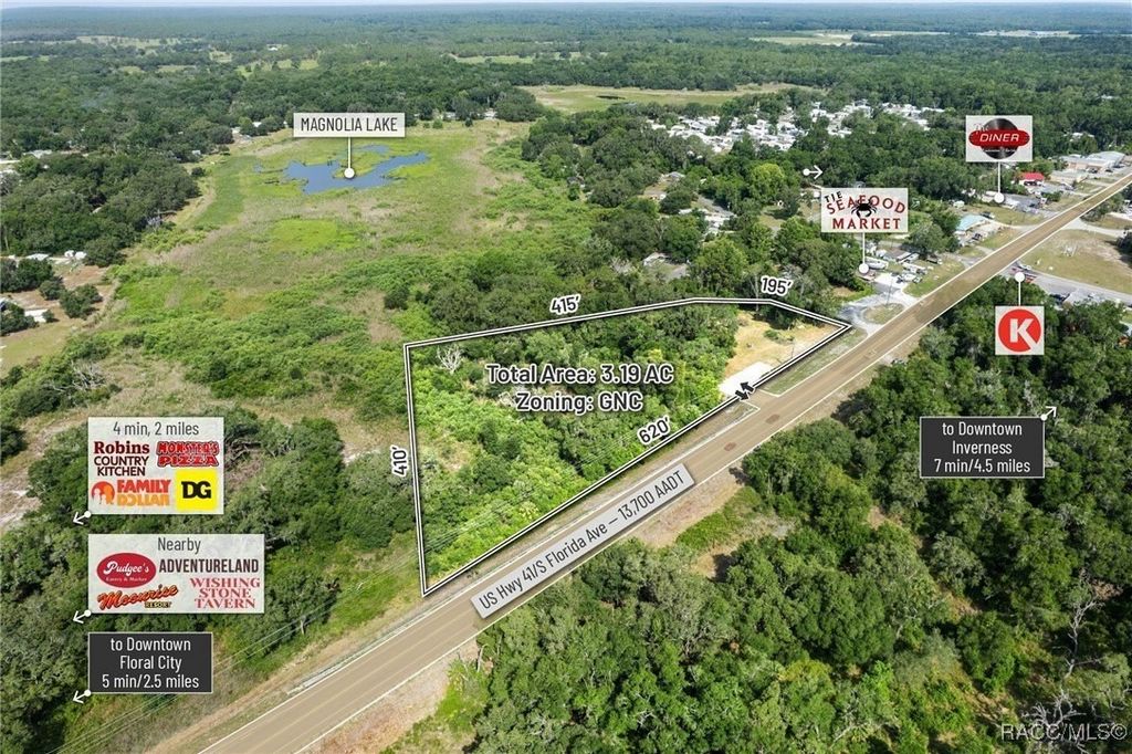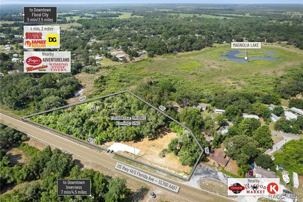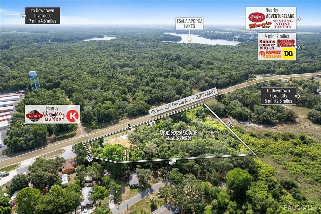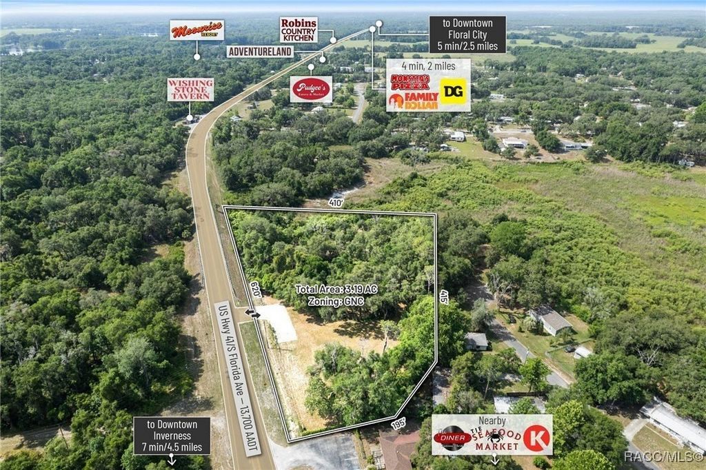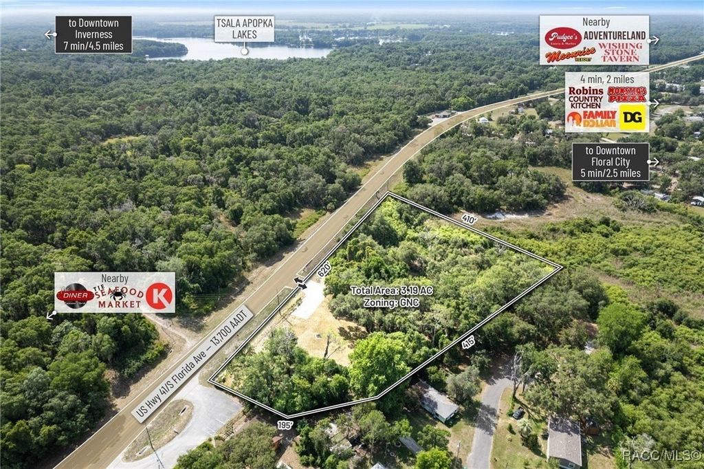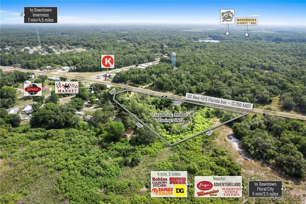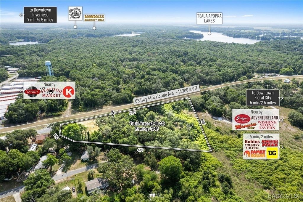 Citrus County, Florida, this 3.19-acre parcel offers a rare opportunity to secure commercial land with high development potential. Zoned GNC (General Neighborhood Commercial), the site boasts approximately 620 feet of direct frontage on US Highway 41, with a traffic count of approximately 18,200 AADT, and enjoys full median-cut access accommodating both northbound and southbound traffic flows. This high-intensity commercial zoning allows for a wide variety of uses including retail, shopping centers, medical and professional offices, gas/convenience stations, and auto or marine repair. Additionally, the site supports multifamily development of up to 10 units per acre, contingent upon a PUD approval, making it a highly versatile investment option. Topography is gently rolling with the majority of buildable areas positioned above the base flood elevation (BFE 29.3'), minimizing site prep and potential fill costs-GIS data indicates portions of the site exceed 37' in elevation. The property is centrally located with easy access to surrounding growth markets: Lecanto (17 miles), Beverly Hills (20 miles), Crystal River (24.5miles), and Homosassa (20 miles). Citrus County, home to 153,600 residents, is projected to grow to 350,000 by 2030, driven by strategic infrastructure investments such as the $135+ million Suncoast Parkway extension which enhances regional connectivity and positions Citrus as a key gateway to the Tampa-St. Petersburg-Clearwater metro-the 18th largest MSA in the U.S. Within a 15-minute drive, the site serves a population of 17,551 residents with a median household income of $53,000 and an average age of 61.2, aligning with demand for essential services, medical, and retail development. With its prime US-41 visibility, zoning flexibility, favorable topography, and access to a rapidly expanding population base, this parcel offers a unique and affordable development opportunity in one of Florida's fastest-growing regions.