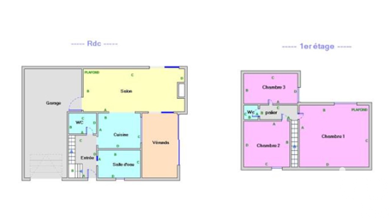 À l'étage : Palier, WC, 3 chambres.Double vitrage très haut de gamme au RDC , chauffage électrique.Profitez des aides pour la rénovation énergétiques ( DPE G) qui diminueront considérablement la facture des travaux d'embellissement par la même occasion! Honoraires d'agence à la charge du vendeur.