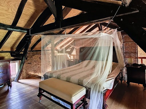 Boven bevindt zich op een mezzanine een ruime slaapkamer van 30 m² met douche en wastafel. Buiten kunt u genieten van een prachtige binnenplaats, een grote kelder en een schuur.