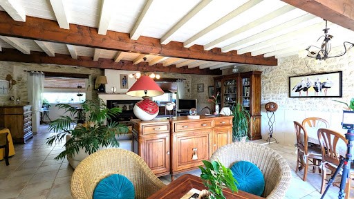 Une maison principale d'environ 200 m² avec 3 chambres, un bureau, une pièce de vie lumineuse de 65 m² avec poutres apparentes et cheminée, une grande cuisine de 30 m² et une véranda ouverte sur le jardin et un grand garage de 60M2 environ.