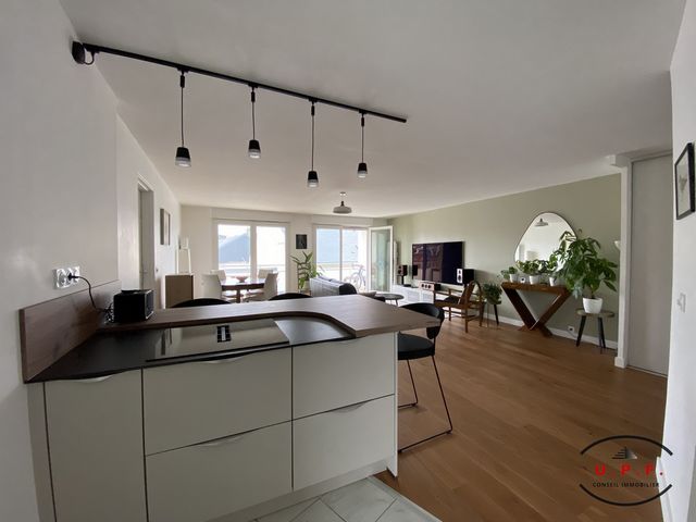 Au 4ième étage avec ascenseur ce bien dispose d'une superbe pièce de vie avec cuisine ouverte de 44m2. Le tout donnant sur 2 blacons dont le prinipale est exposé plein sud avec vue sur les toits du centre ville. Coté nuit, 2 chambres dont une suite parentale avec salle de douche et wc + une 3ième pièce bureau/chambre d'amis. Salle de bains. wc séparés.