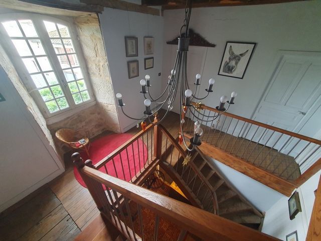 Au-dessus, une exceptionnelle pièce à vivre de 80 m2 aménagée dans les combles, mais très lumineuse et spacieuse, comprenant salon, bibliothèque et chambre., avec tour, pigeonnier et poêle à bois.