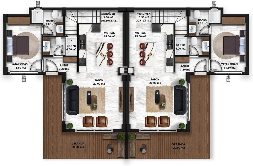 - Terrace Ville di design esclusive con vista sul mare ad Alanya Engikum Le ville si trovano nel quartiere Incecum di Alanya, in rapido sviluppo. Conosciuta per il suo bellissimo mare, le zone esclusive e le spiagge meravigliose, ENGIKUM è una popolare destinazione turistica. Oltre ad attrarre turisti locali e internazionali con le sue bellezze naturali, l'area è anche una località ambita per gli investitori. ... si trovano a 3 km dal mare, a 4,8 km dal Parco Naturale di Incikum, a 9 km dal Sea Dolphin Park, a 27 km dal centro di Alanya, a 65 km dall'aeroporto di Gazipaşa e a 87,4 km dall'aeroporto di Antalya. Le 24 ville bifamiliari sono costruite su una superficie di 7.000 m², ciascuna con due piani e 3 camere da letto. Le ville includono una piscina privata, un giardino privato, un parcheggio, un generatore e telecamere di sicurezza. Le ville sono dotate di bagno e mobili da cucina, sistema satellitare centrale e tende. Inoltre, verrà consegnato con materiali decorativi di alta qualità, tra cui finiture in legno e ceramica.